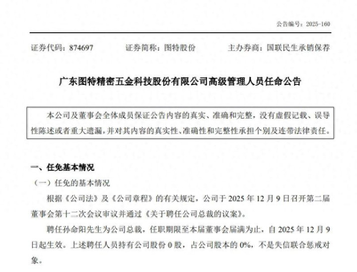 12月11日,图特股份公司正式发布公告,聘任拥有二十余年泛家居行业经营管理经验的 孙命阳 为总裁,全面主持日常经营管理工作。这位深耕美的集团10多年的职业经理人,将在企业资本化冲刺与全球化拓展的双重节点,为这家顺德本土企业注入新动能。