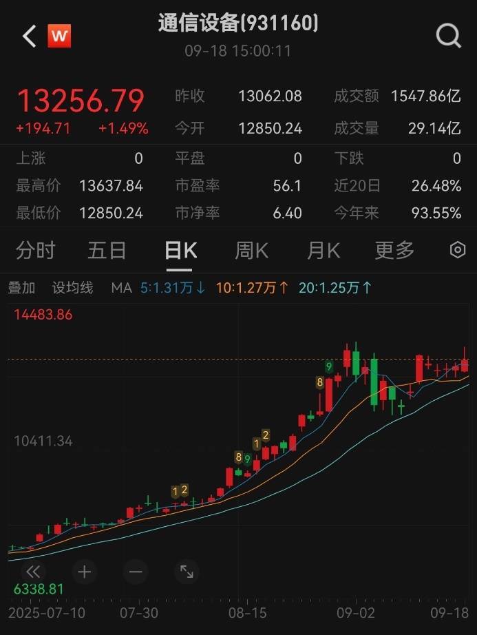 然而,通信设备指数在上午便迅速反弹,跟随国产算力概念强势翻红拉升。截至午间收盘,通信设备板块涨幅在各大板块中位居前列,展现出了强大的韧性。这种 “当跌不跌” 的情况在股市中往往具有特殊意义。下午受大盘集体跳水影响,通信设备指数涨幅有所回撤,最终收盘上涨1.49%,很大程度上可确认市场对利空已脱敏,从过往经验来看,这一现象往往是短线行情的重要转折点,极有可能成为下一波涨势的起点。