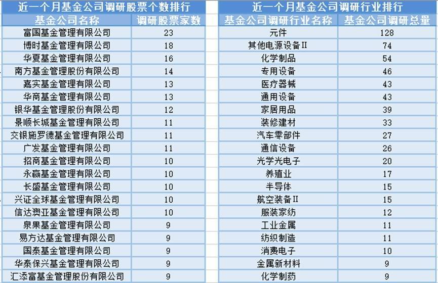 近一个月(2月8日-3月10日),富国基金参与公司调研的数量最多,共调研23家上市公司,此外调研较为活跃的还有博时基金、华夏基金和南方基金,分别调研18家、16家、14家上市公司;从调研行业上来看,基金公司对元件行业的上市公司调研次数最多,共有128次,其次是其他电源设备Ⅱ行业,基金公司调研了74次。