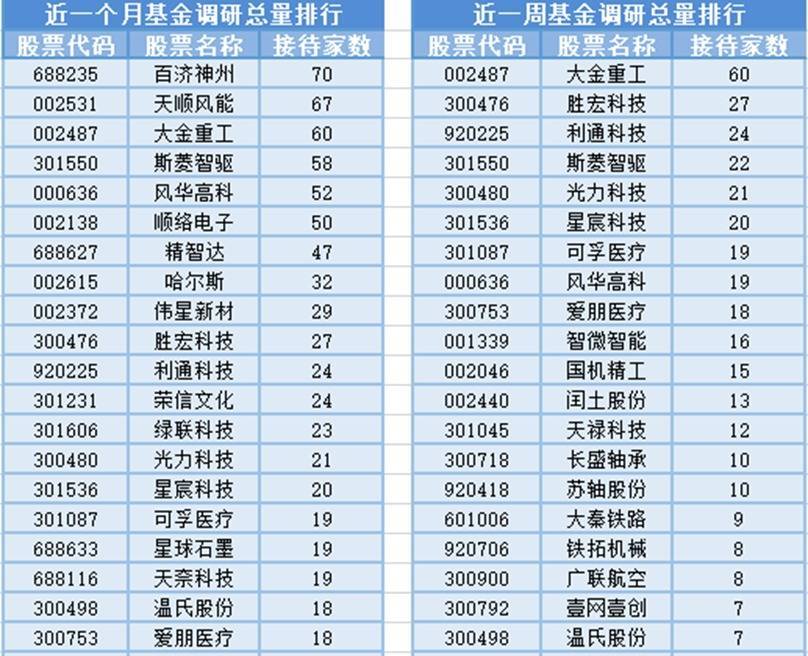 从个股调研情况上来看,最近1个月(2月8日-3月10日)最受公募基金关注的是百济神州,百济神州属于化学制药行业,主营业务为研究、开发、生产以及商业化创新型药物。共有70家基金管理公司参与调研,其次是天顺风能和大金重工,分别接受67家、60家基金管理公司的调研。