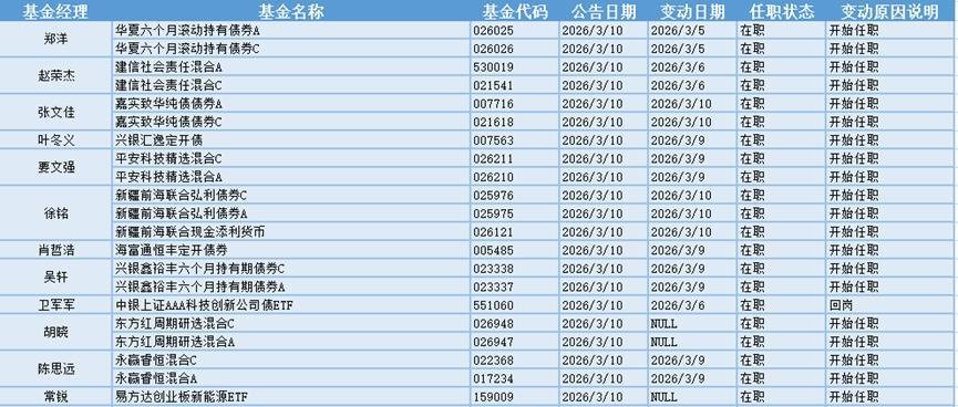 基金经理是一只基金产品最核心的成员,能决定一只基金的投资方向、投资策略以及投资风格,基金经理出色的择时选股能力和调研预测能力是基金业绩的有力保证,所以基金经理是投资者在选择基金产品时的重要依据。基金经理的变动很大程度上会影响到基金产品未来的表现,是一个需要特别关注的信息。3.10日共有16位基金经理发生任职变动。