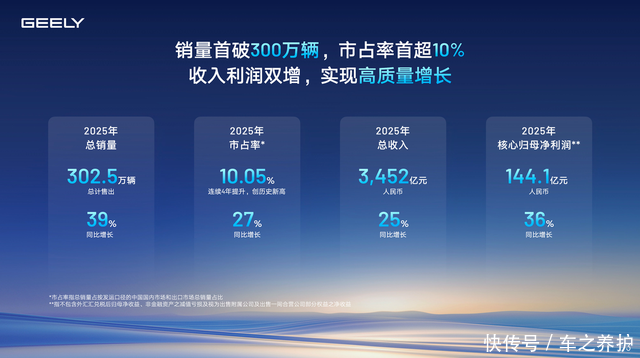 3452亿营收,同比增长25%,创历史新高。302.5万辆销量,首次突破300万大关。这组数据放在任何一家车企身上都足够亮眼,但吉利财报里真正值得玩味的,是144.1亿的核心归母净利润——同比增长36%,利润增速跑赢了收入增速。